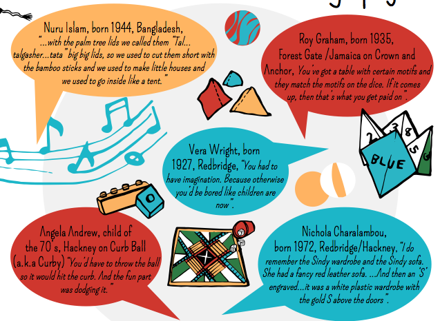 Best Days of Our Lives is a community heritage project I’ve been coordinating with volunteers. We’ve been talking to people about their experiences of play in east London and it’s been a privilege to share moments that make you crack up laughing and others that pull hard on emotions. But it’s the sound of your voice, the biggest pleasure is listening to how you speak. Some excerpts here; Margaret, Helen, Roy E